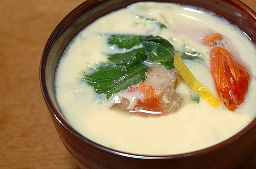Pues sí, aunque suene raro estamos hablado de un flan (salado, no dulce) hecho a base de caldo de pescado con pollo, entre otros ingredientes. Aunque dicho así a muchos no les suene apetitoso, en mi opinión es uno de los platos japoneses que más se adaptan a los gustos de un paladar occidental (y todos mis amigos que lo han probado lo confirman). Es además uno de los pocos platos japoneses que no se comen con palillos sino con cuchara.