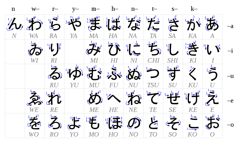 En las siguientes tablas se incluyen los Hiragana y Katakana, y el orden y dirección en el cual hay que escribir los trazos. Es recomendable practicar una y otra vez la escritura de los mismos, prestando mucha atención al orden de escritura y dirección de los trazos, si se dispone de ellos, utilizando cuadernos de caligrafía. Una vez aprendidos conviene seguir pracricando escribiendo palabras y frases enteras. Una vez perfectamente dominados se podrá comenzar a estudiar los kanji.